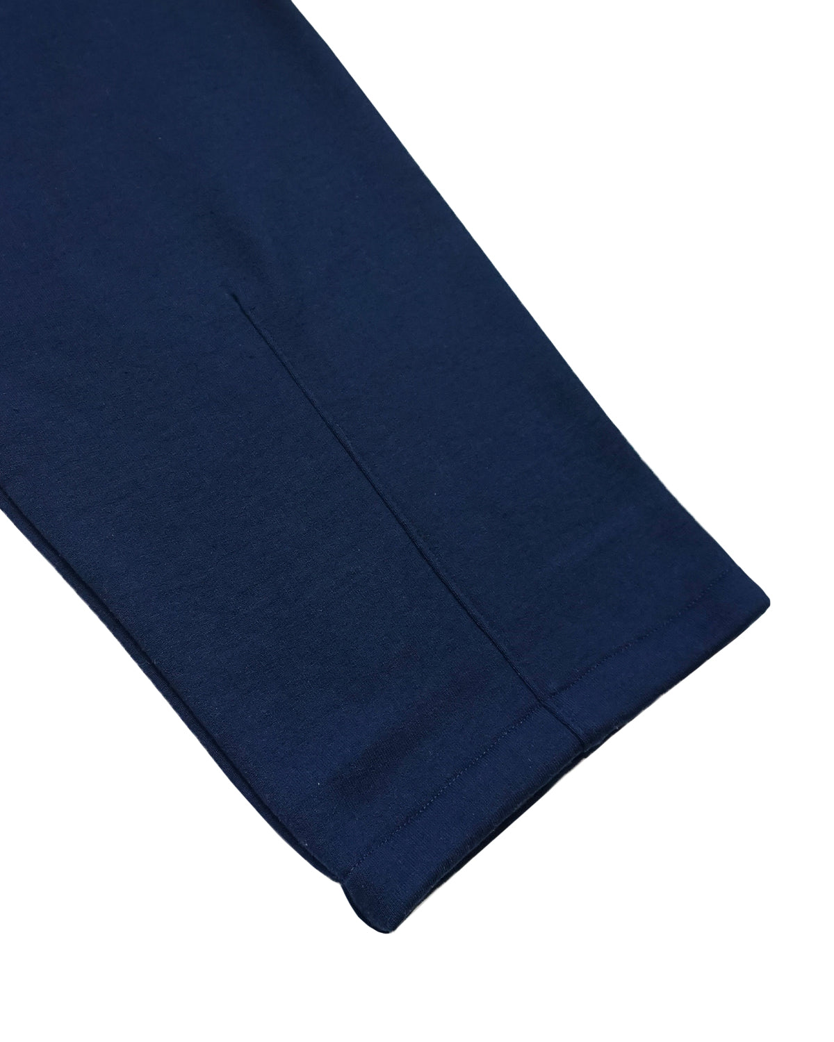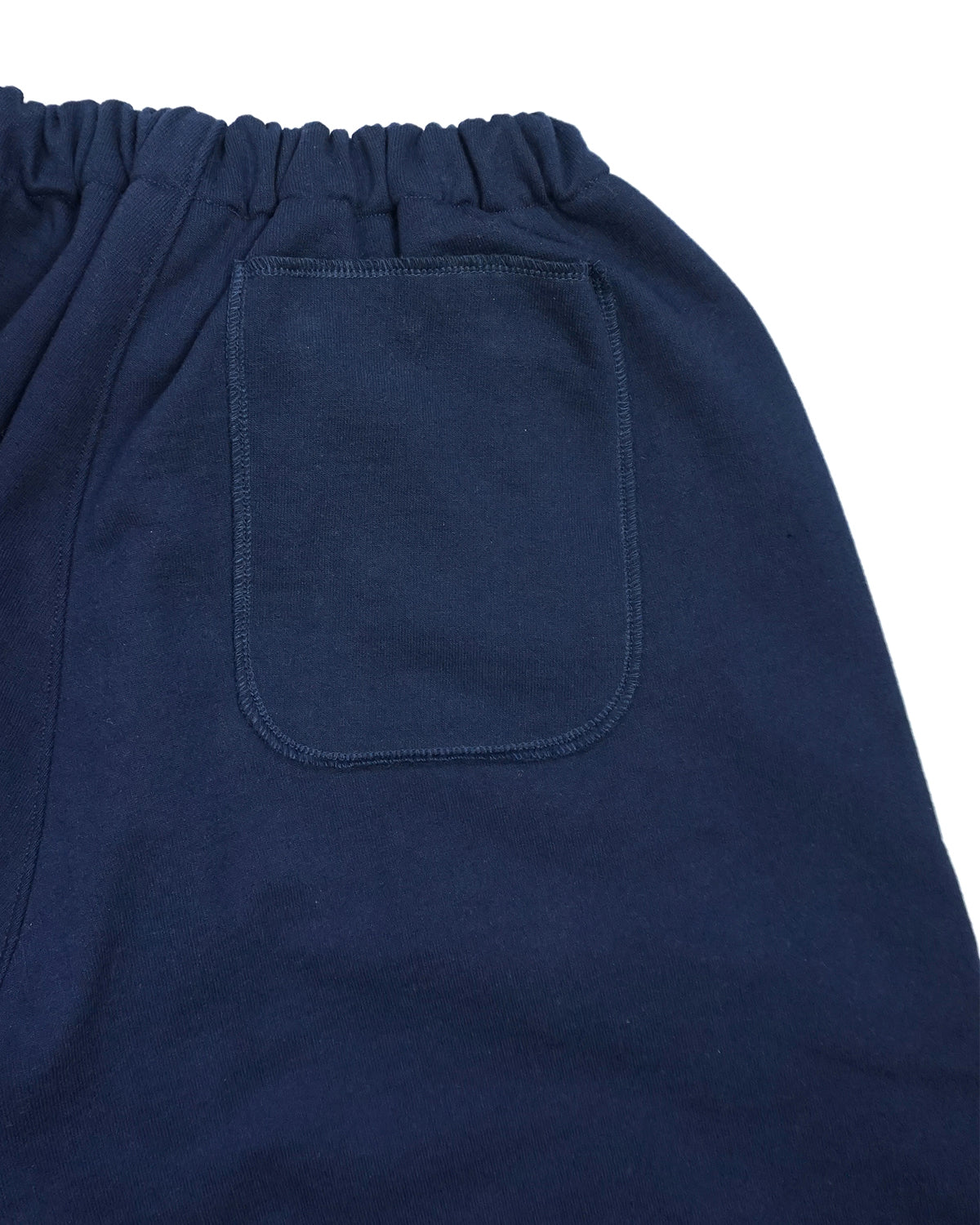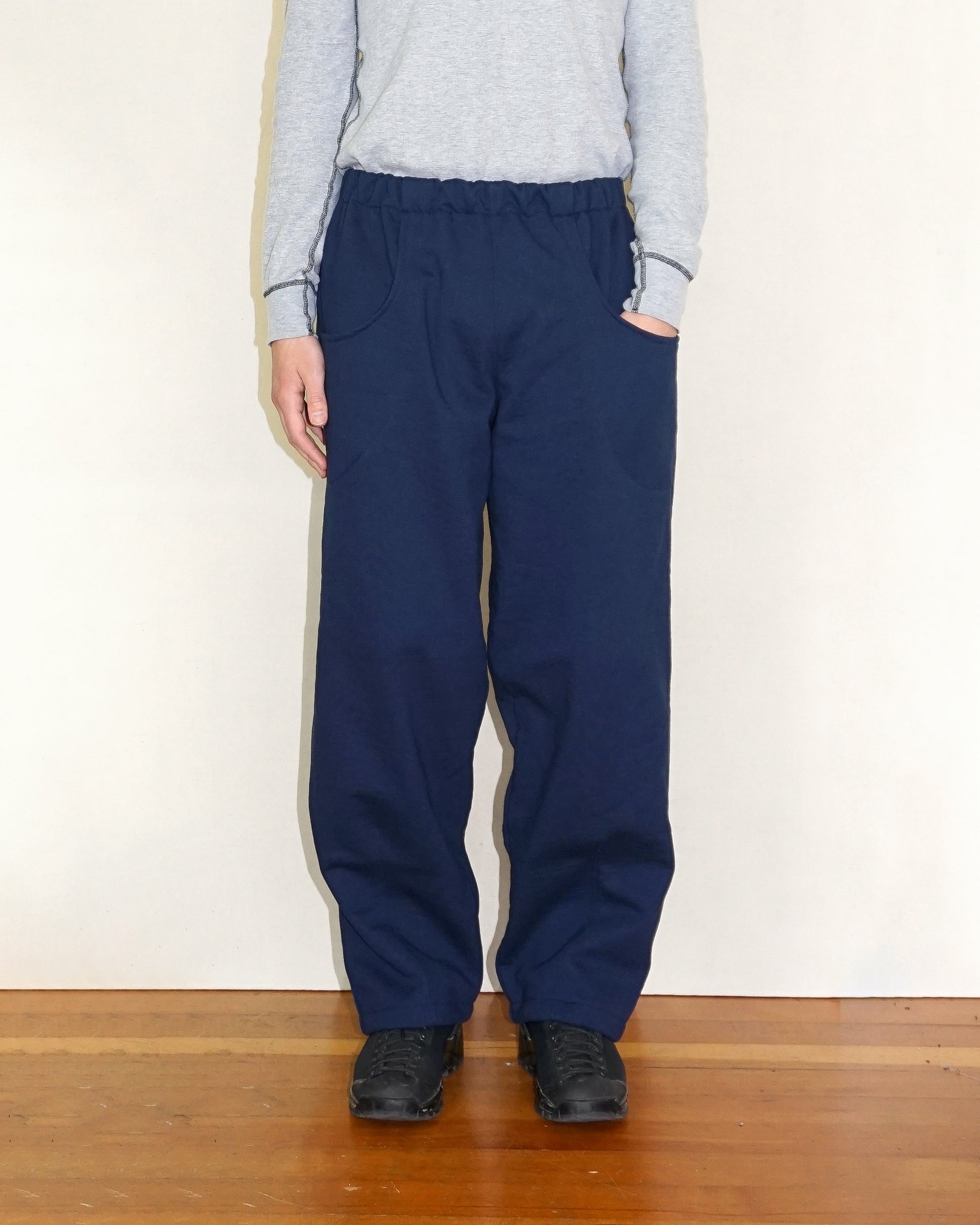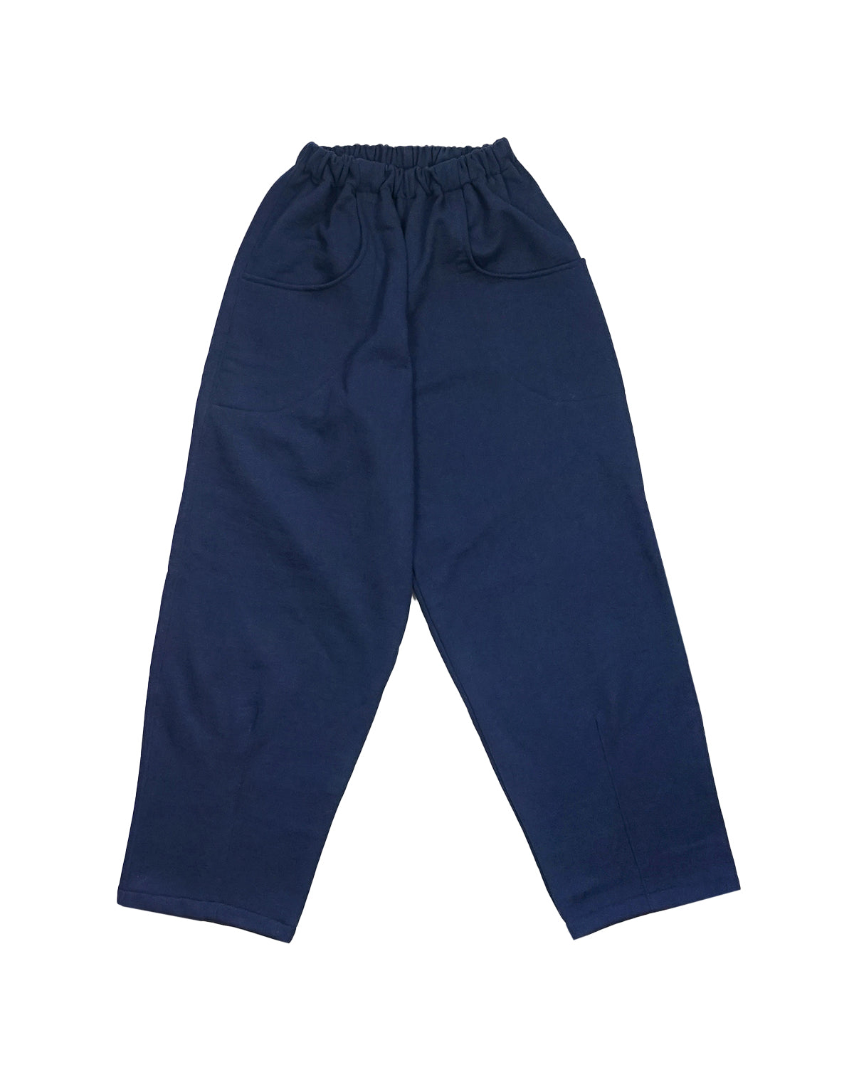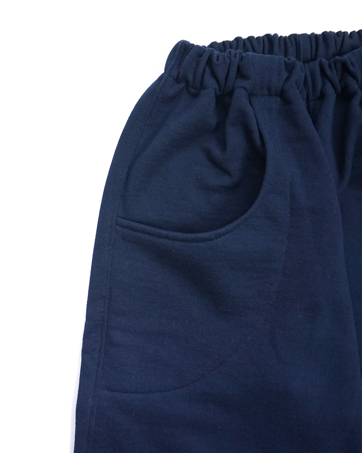 Features: Dropped length rounded edge front pockets (shallow depth), darted ankles, single back pocket with exposed overlock stitch, and elastic wasitband construction.