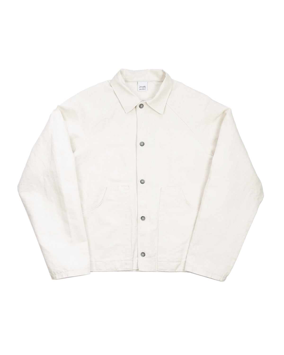 Featuring raglan sleeve construction, grey horn buttons, and waist level pockets.