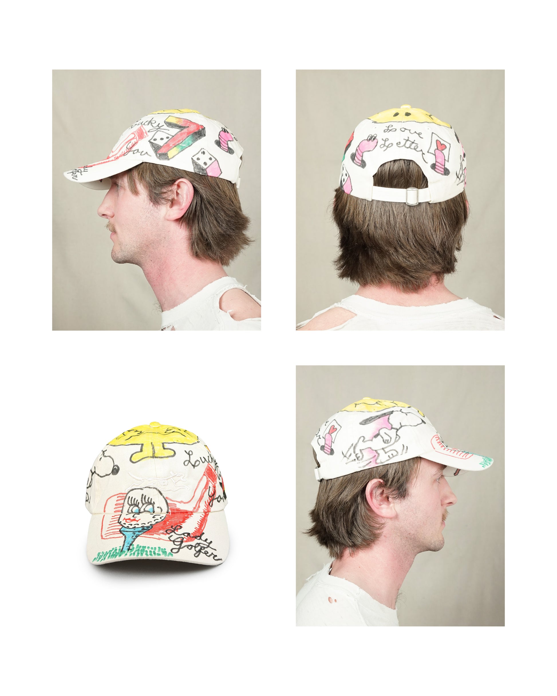 Released 03.20.2025 as part of the Bird Like Daag Collection. 6-Panel unstructured hat with hand drawn treatment by bird like dog and daag logo embroidery. Constructed from 100% cotton twill. Low profile shape with adjustable self fabric strap and brass hardware.