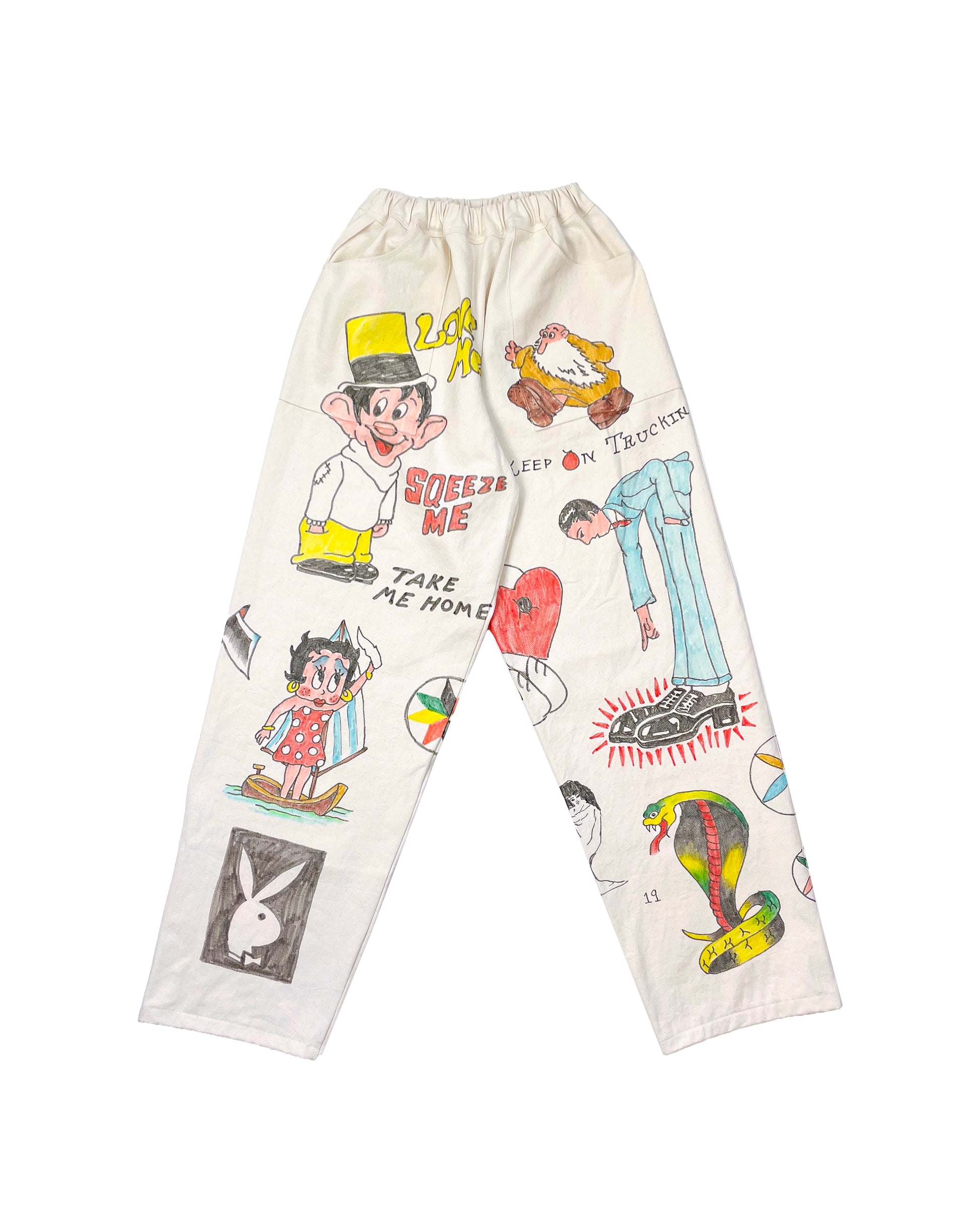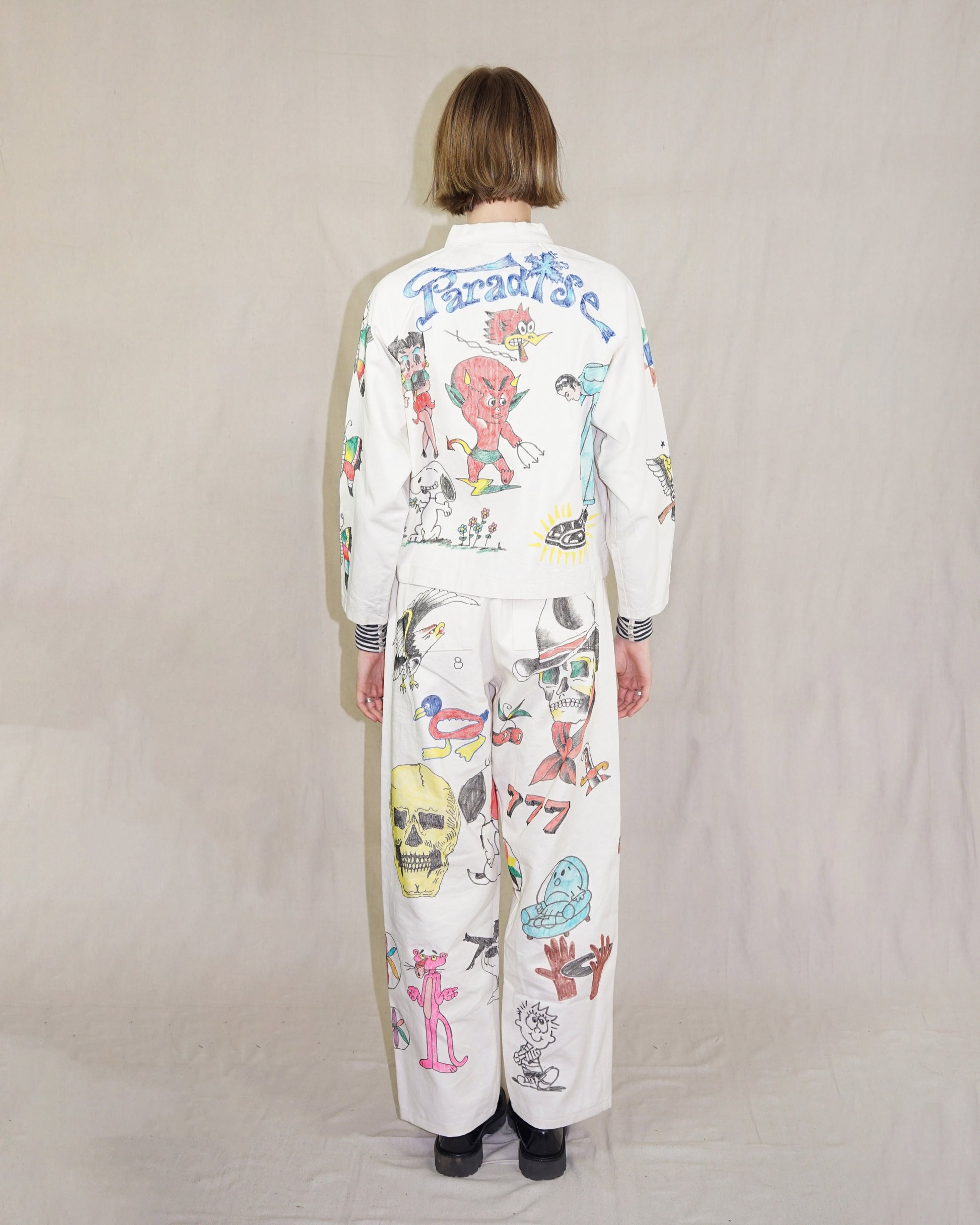 1/1 pant sewn by daag with hand drawn treatment by bird like dog
