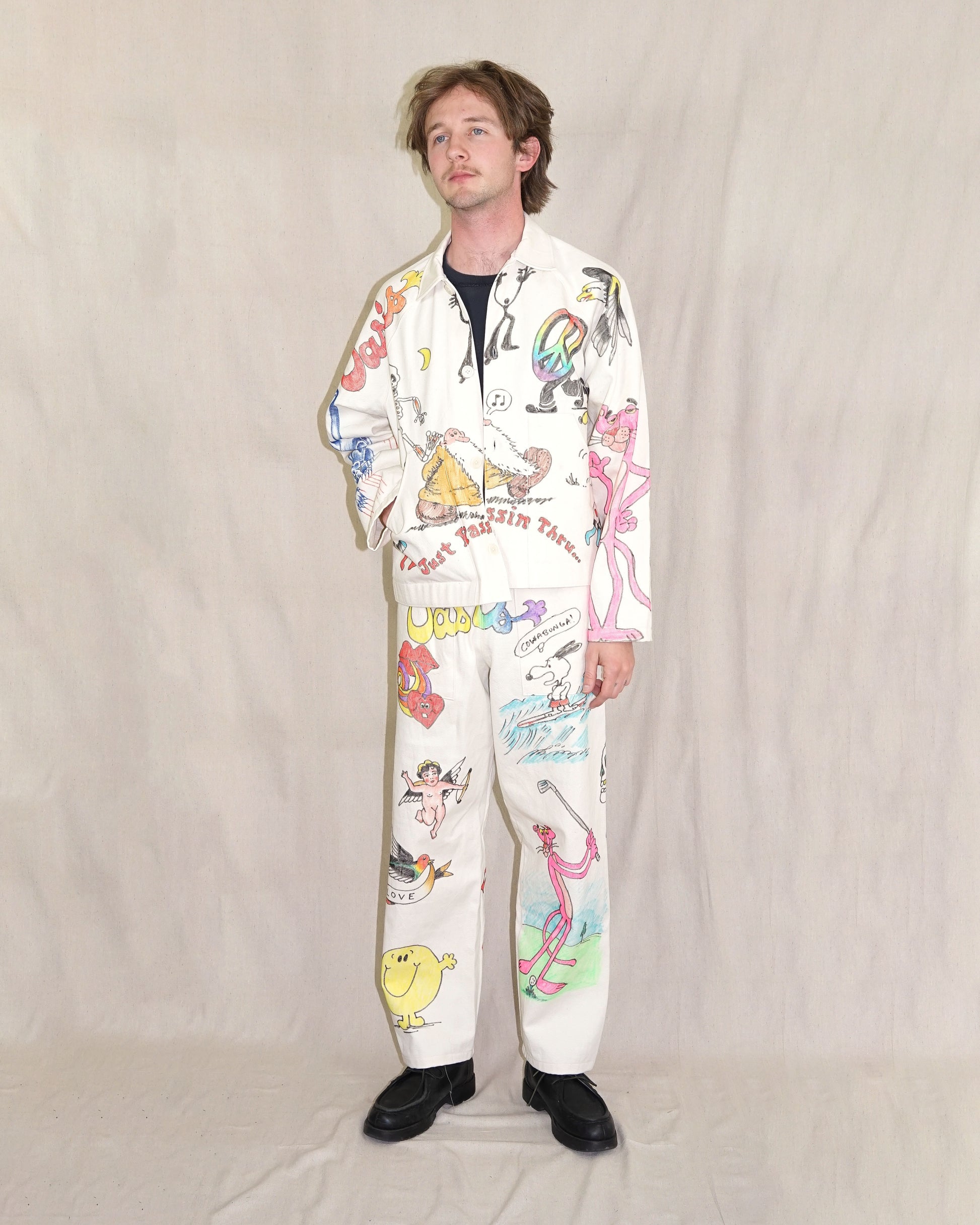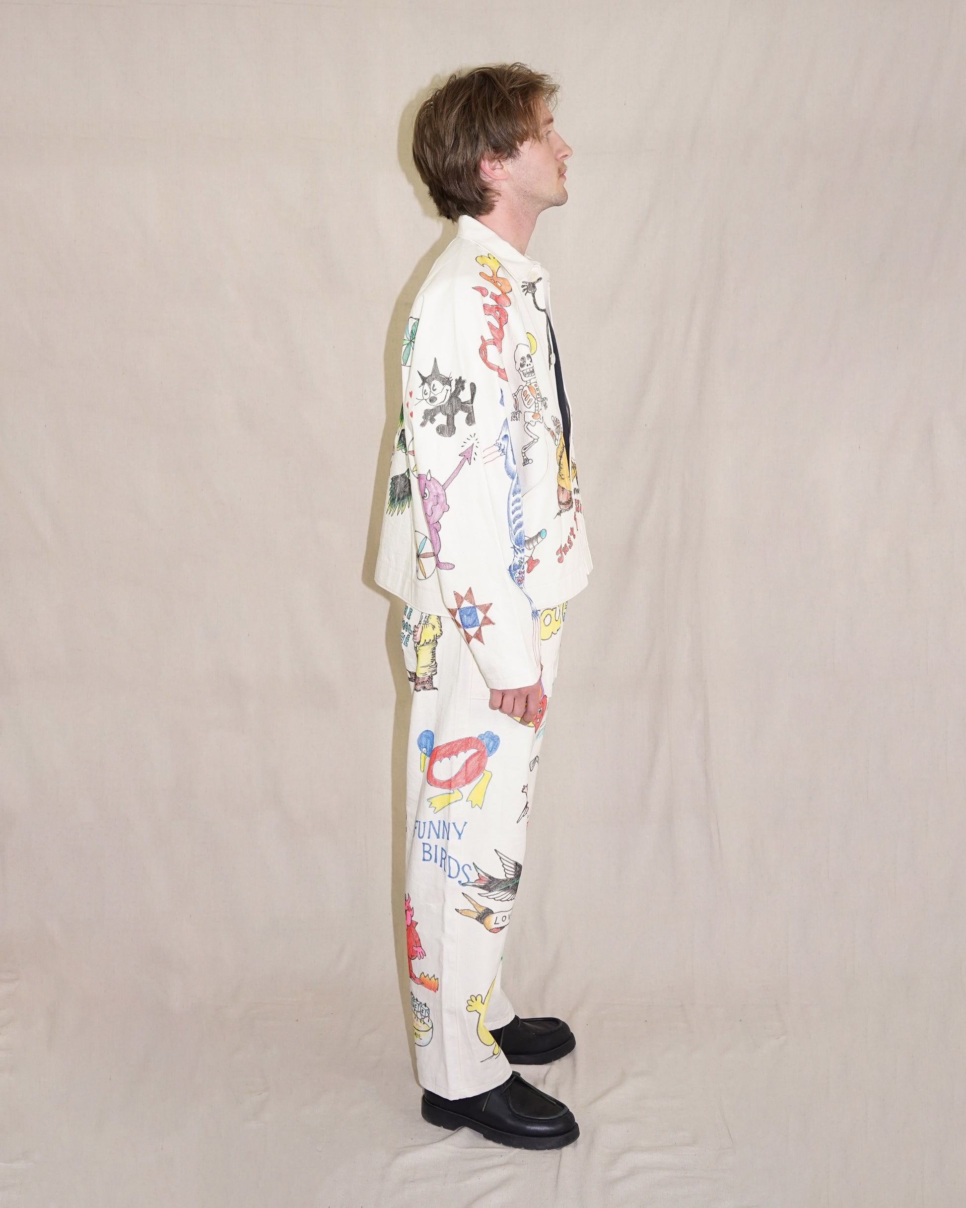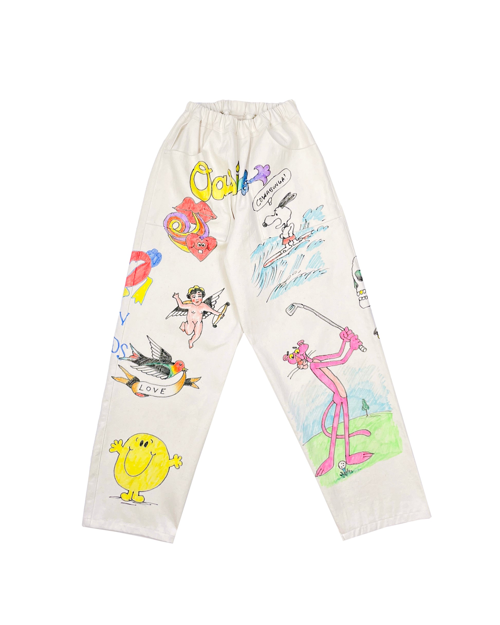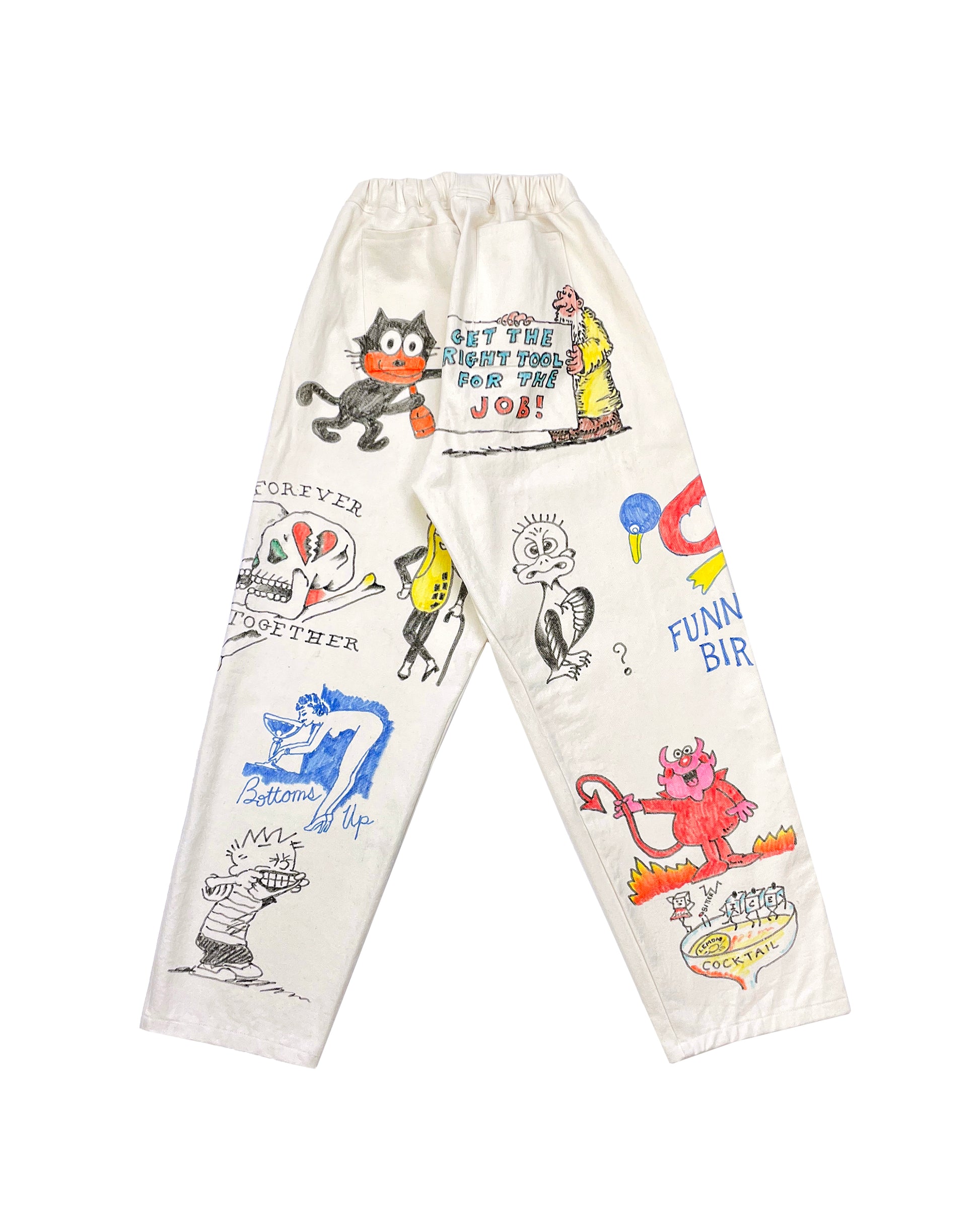 1/1 pant sewn by daag with hand drawn treatment by bird like dog