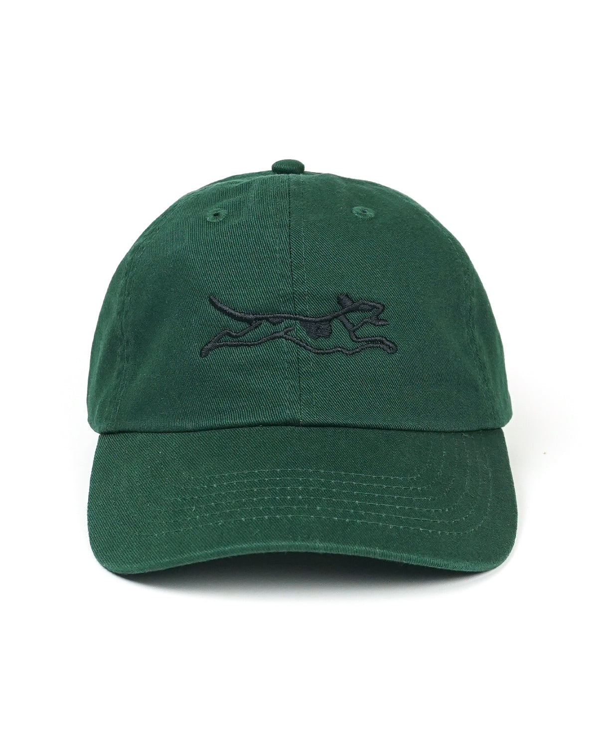 Forest Green 6-Panel unstructured hat with black daag logo embroidery. Constructed from 100% cotton bio-washed twill. Low profile shape with adjustable self fabric strap and brass hardware.