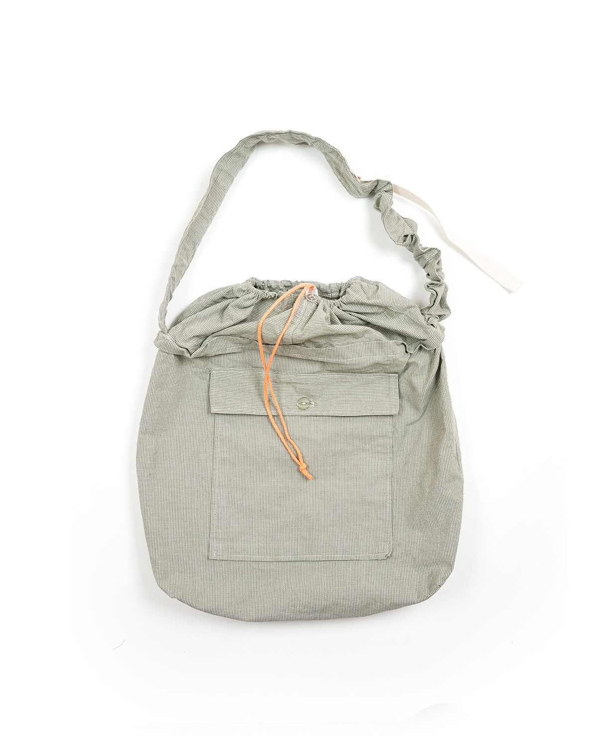 Featuring cotton cord cinch, transparent plastic toggle, cotton webbing adjustable with plastic hardware, and front pocket with semi-translucent button.
